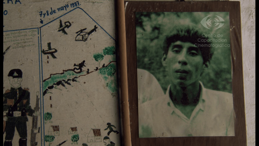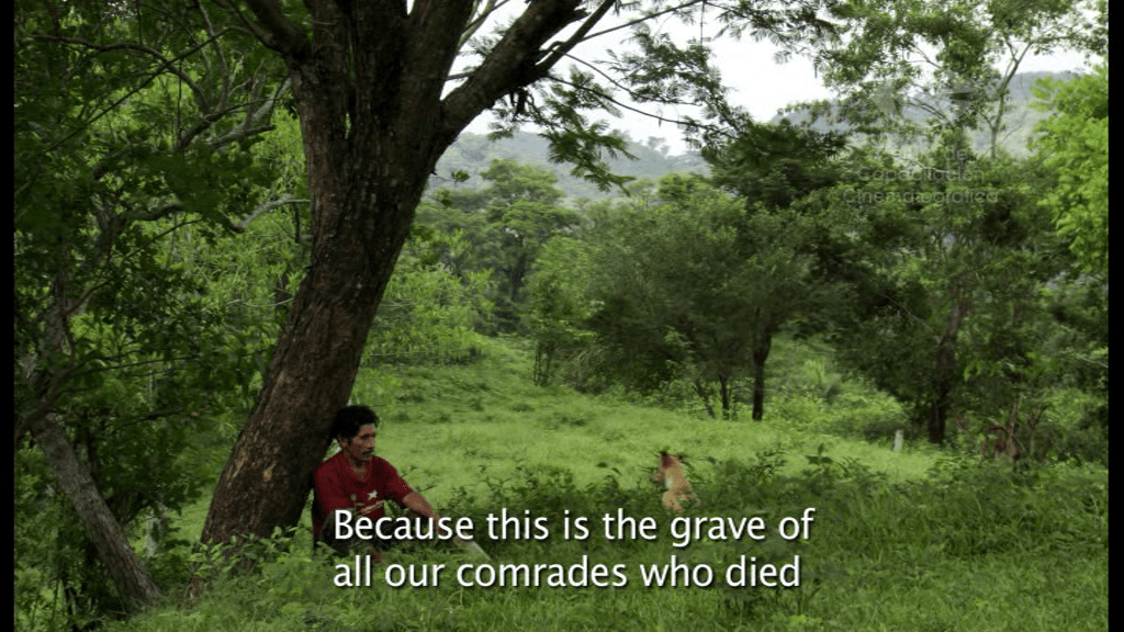 Hay varias razones por las que quiero hablarles de esta película. La más importante para mí es la presencia que el territorio ocupa en la película. En un momento, uno de lxs protagonistas dice que ama los bosques por donde huyó con su comunidad. Ahí reposan sus muertos y muertas, dice. Pero también la película nos muestra la forma en que los cerros, los bosques o una cueva protegieron como pudieron a estos insurgentes que huían del ejército y su maquinaria de muerte. Las tomas del paisaje integran varios momentos de la película. Ofrece al menos dos niveles de vida del territorio como algo más que un mero paisaje o telón de fondo. El territorio aquí tiene una agencia; cuidó a lxs subversivxs, niñxs, adultxs, ancianxs.
