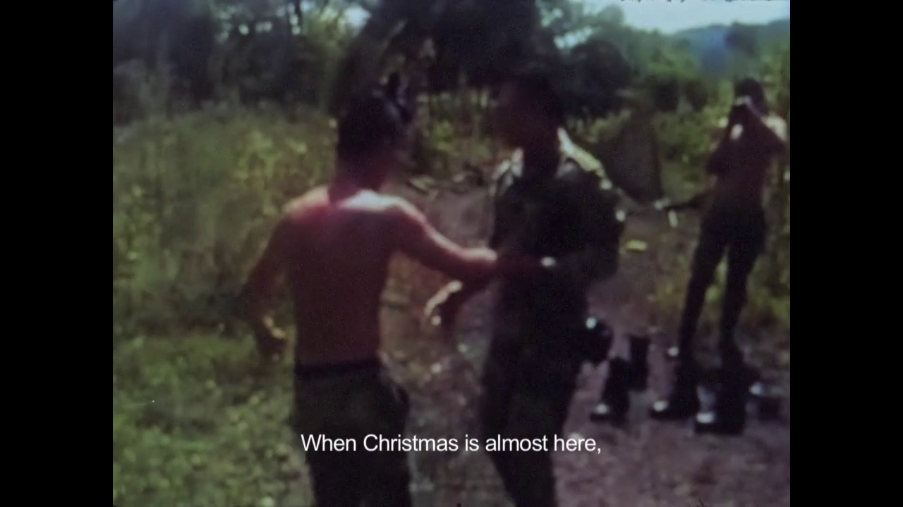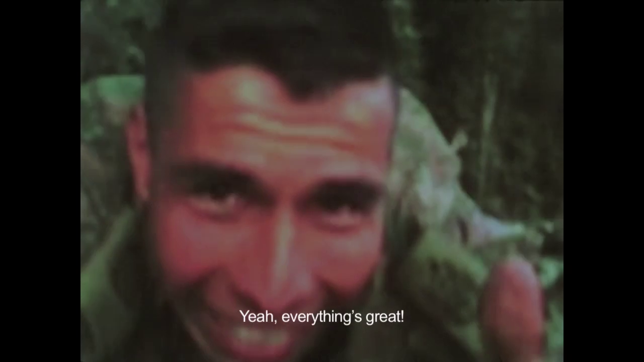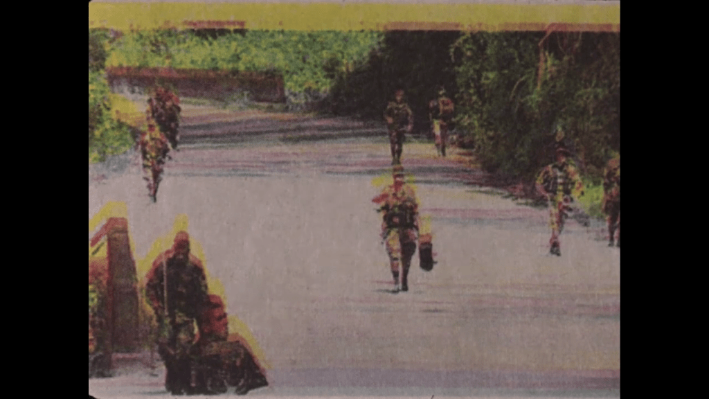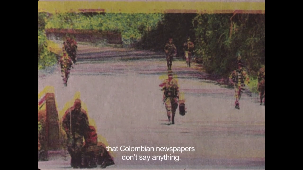 Las imágenes que me hicieron pensar concretamente en todo esto pertenecen a un archivo que puede ser llamado basura, y es ahí donde reside su potencia, acentuada gracias al montaje por cercanía y distancia. Este archivo son las imágenes en los periódicos defectuosos —en algunos de los cuales se ven imágenes de esta guerra— y grabaciones hechas con teléfonos celulares por soldados del ejército en la selva. En unos videos se ven a soldados celebrando la navidad en el monte, echándose los pasos prohibidos (subversivos), y en otros las acciones en combate y posteriormente el registro de los guerrilleros dados de baja (en el aire queda la presunción de que pueden ser falsos positivos). Su efecto radica en la mala calidad y en la distorsión de estas representaciones de los combatientes, porque es una mirada que no es clara, que no tiene la nitidez, por ejemplo, de la propaganda de Estado de las fuerzas armadas, que tanto inundó las pantallas de los televisores en los 2000.