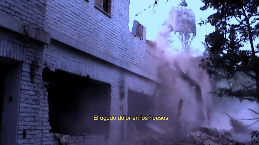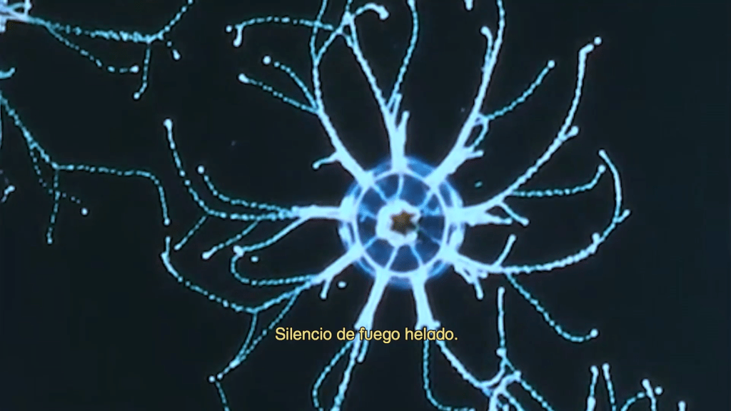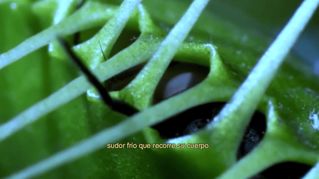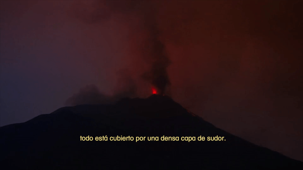 Otra manera en que esa negatividad coge vuelo o, mejor, teje estos nobles tejidos del filme es el sonido y, por supuesto, la «ausencia de este». En lugar de la tí-pi-ca voz en off que suele acompañar estos filmes, la voz, entre lírica y confesional, ocupa el texto, el subtítulo. Esto da lugar a que el diseño sonoro nos deje oír ciertas formas del dolor y de la muerte. El sonido acompaña una serie de archivos de grabaciones volcánicas, microscópicas, movimientos celulares (precisamente) y telúricos que no quieren representar nada de primerazo, que se sostienen en el zumbido y en los goteos para seguir contando la historia de una voz que ve la muerte y se pregunta por la memoria de lo amado.
