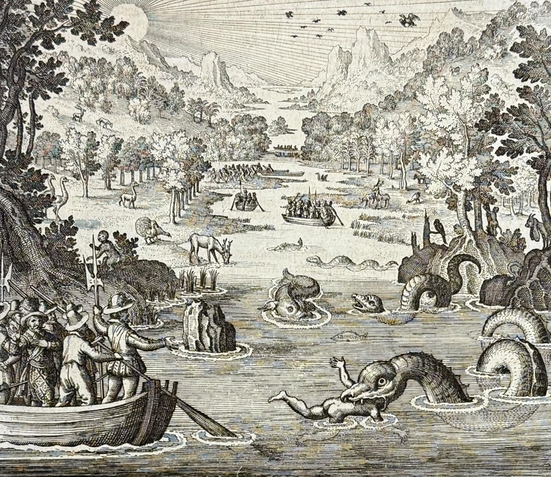 Imágenes: (1) Sir Walter Raleigh. The Discovery of the Large, Rich, and Beautiful Empire of Guiana, 1655; (2) Nativos de America del Sur sobre un monstruo marino, Grabado Benedictino, 1621; (3) Mujeres guerreras del Amazonas, grabado de Theodore de Bry, 1599.