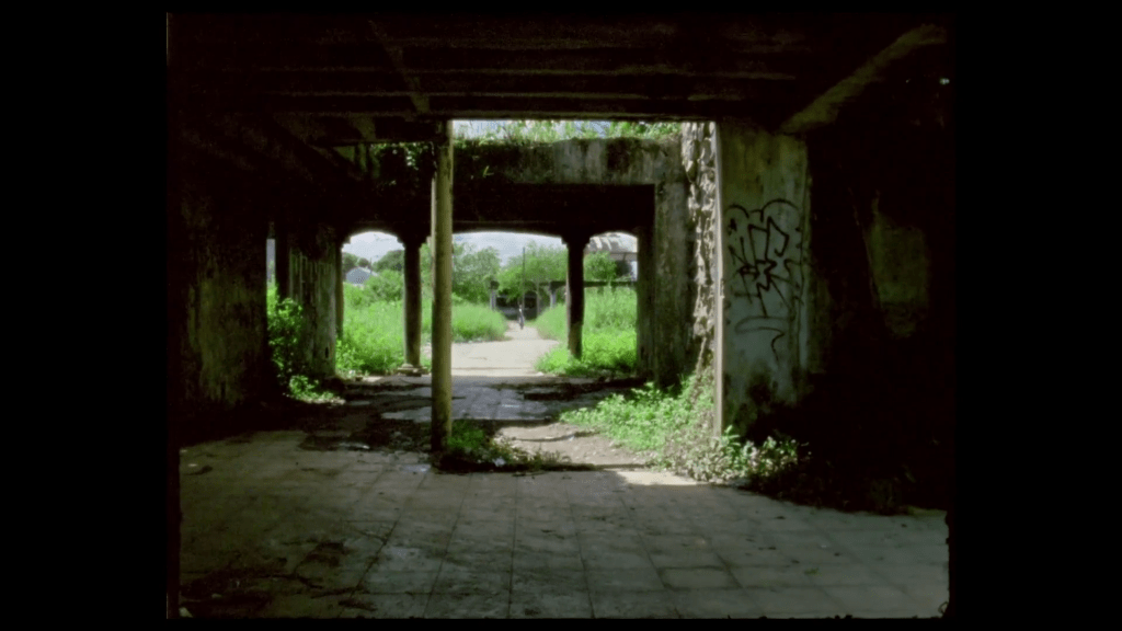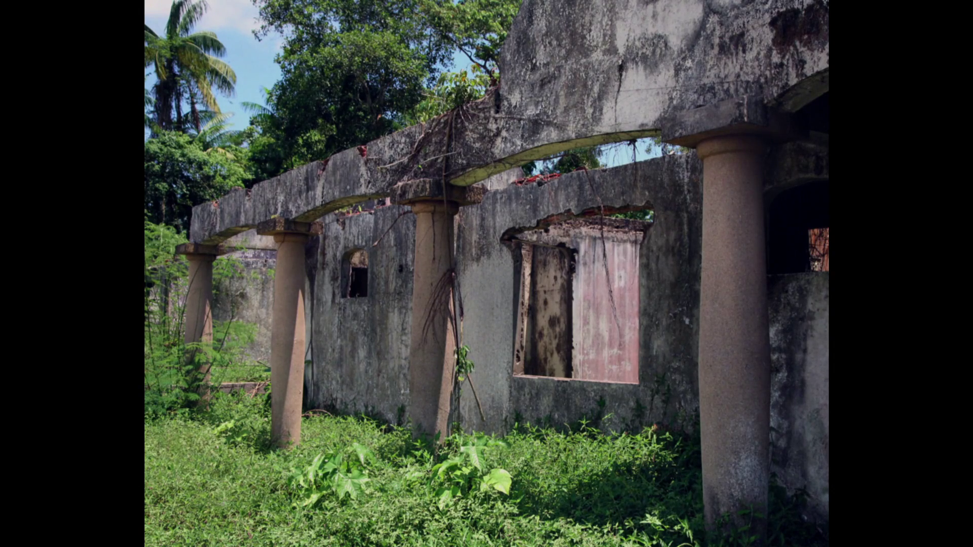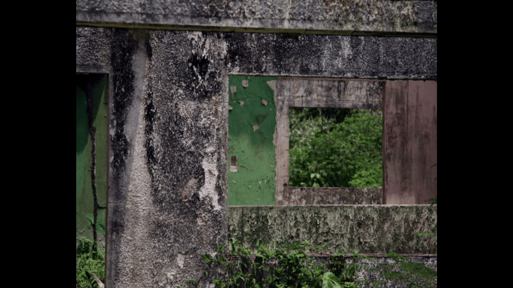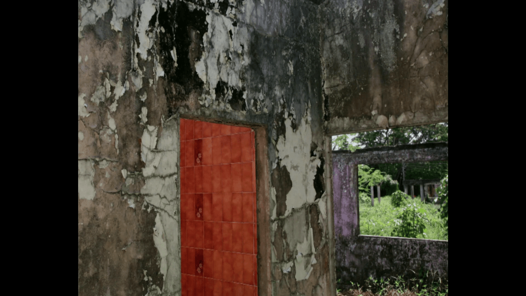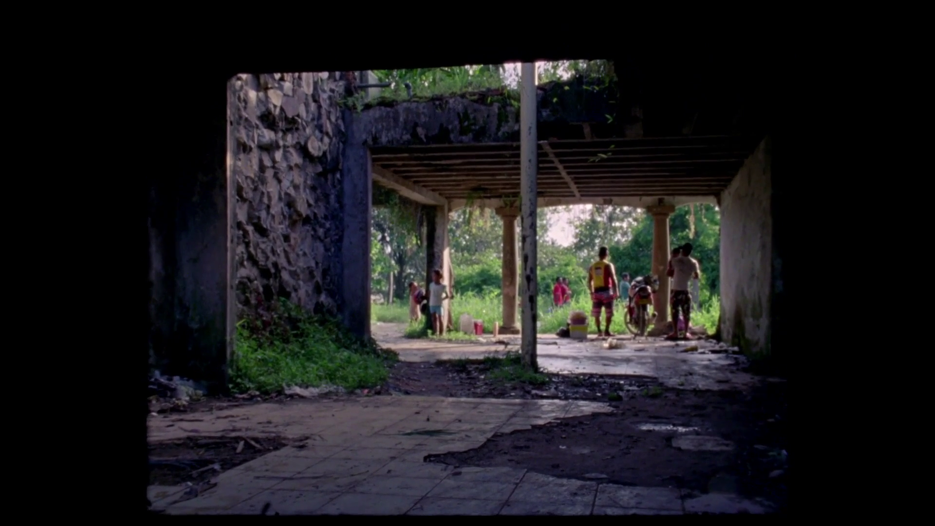 Entre todos estos momentos, es especialmente elocuente la yuxtaposición del sonido de la serie de TV sobre estas ruinas, lo que genera una capa alucinada a esas imágenes. En esos espacios que la ruina ya no contiene y que han sido devueltos a la intemperie, es decir, a la selva, esos sonidos catódicos rebotan como fantasías insulsas y pasadas, de una modernidad siempre impuesta a punta de violencia. Uno no deja de pensar en las bacanales de los mafiosos y la fuerza pública, y también en las torturas o asesinatos que pudieron llevarse a cabo ahí. La luminosidad de esos sonidos y de esas imágenes estalla contra las paredes ruinosas, rayadas, porosas, musgosas, mugrosas que quedan de ese espacio de horror. Y, a su vez, estas paredes —ya ruinas— se ahogan en la inmensidad de la selva. Un eco que se pierde dentro de otro eco.