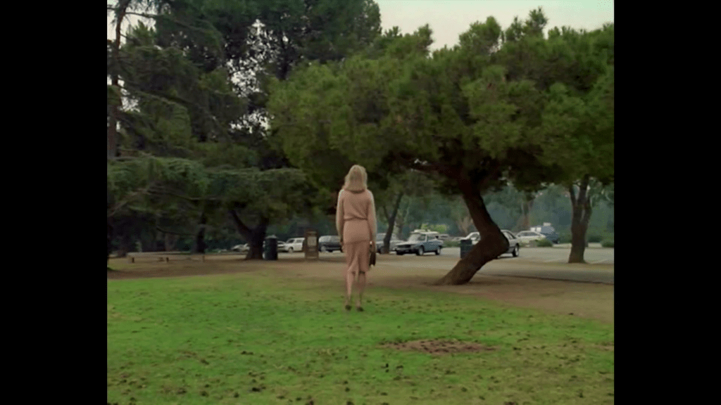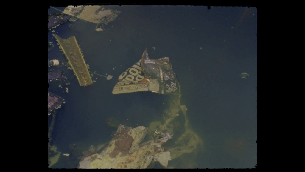 Estos contrastes, estos fuera de lugar, también surgen cuando escuchamos unos diálogos amorosos y afectados de la serie —acompañados con una música romántica— y vemos tomas fijas de basura flotando en sucios charcos dentro de la ruina. En otras escenas, los papeles se invierten: mientras escuchamos el sonido de la selva, de los insectos, de los animales y de la vegetación, vemos a actores de la serie gringa en escenas repetitivas, de espaldas, como cuerpos sin rostro que parecen presencias fantaseadas, hostigadas por los sonidos de esos lugares distantes que nunca pisarán, pero de los que depende la riqueza de ese mundo que han fantaseado a miles de kilómetros.