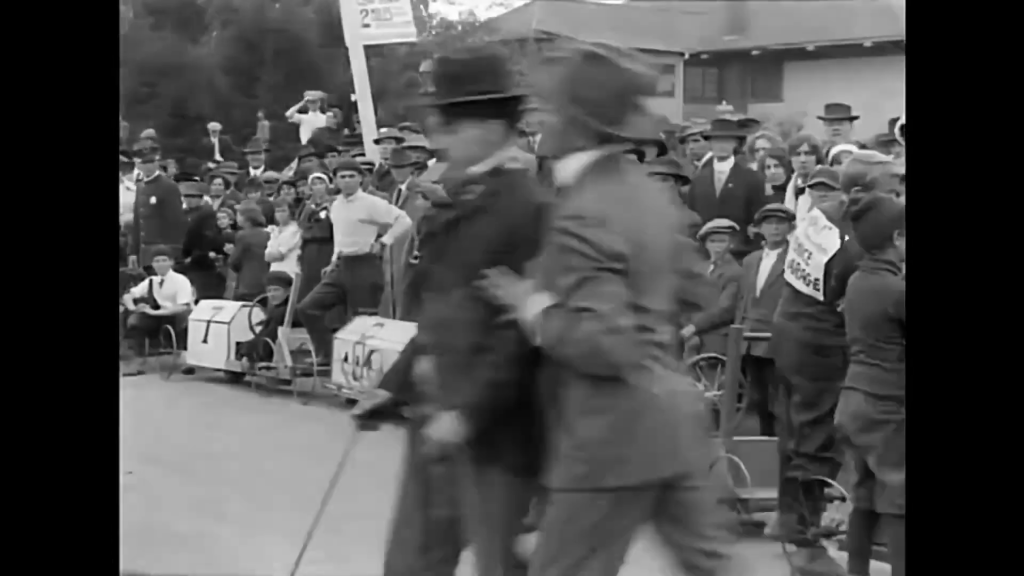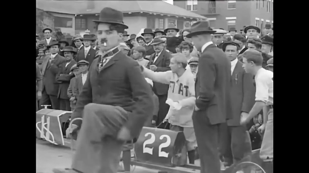 En esta pequeña película notamos otra cosa, que es maravillosa: también es documental. Lehrman y Chaplin rodaron en una carrera real, la Copa Junior Vanderbilt, celebrada en 1914 en Santa Mónica, California, donde improvisaron los gags frente a los espectadores que asistieron ese día al evento. Hay entonces un doble juego, un cruce entre ficción y documental, tanto es así, que al principio la película se presenta como si fuera un noticiero. Así, la película bien podría haber sido solo una crónica social de espectáculos, escenas que fueron predominantes en las primeras dos décadas del cine, pero Lehrman-Chaplin le dan este giro genial: introducen este personaje de ficción en una aparente crónica para poner en tensión la presencia de la cámara. La cámara afecta a todo el entorno del cual pasa a ser parte.