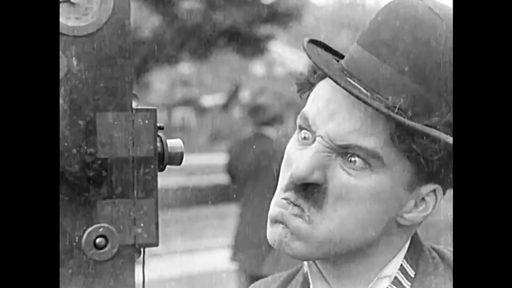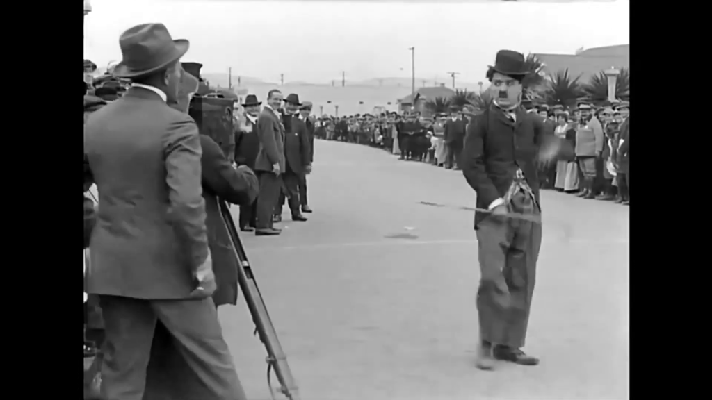Y como si fuera poca la tensión ya generada con el personaje, luego de unos minutos se introduce una segunda cámara que permite ver la primera, es decir, el mecanismo es descubierto. Se rompe entonces la cuarta pared, quizá solo con la intención de explicar el chiste, pero el efecto que produce, incluso 100 años después, es inquietante. Chaplin sigue interponiéndose en el camino de la primera cámara que ahora es visible, pero no de la segunda, que es la que está filmando, desde la cual nosotros vemos. Se adopta el punto de vista del espectador y se hace una superposición de miradas (increíble también pensar que esta es una de las primeras películas en la que se muestra una cámara y un camarógrafo en plena acción).